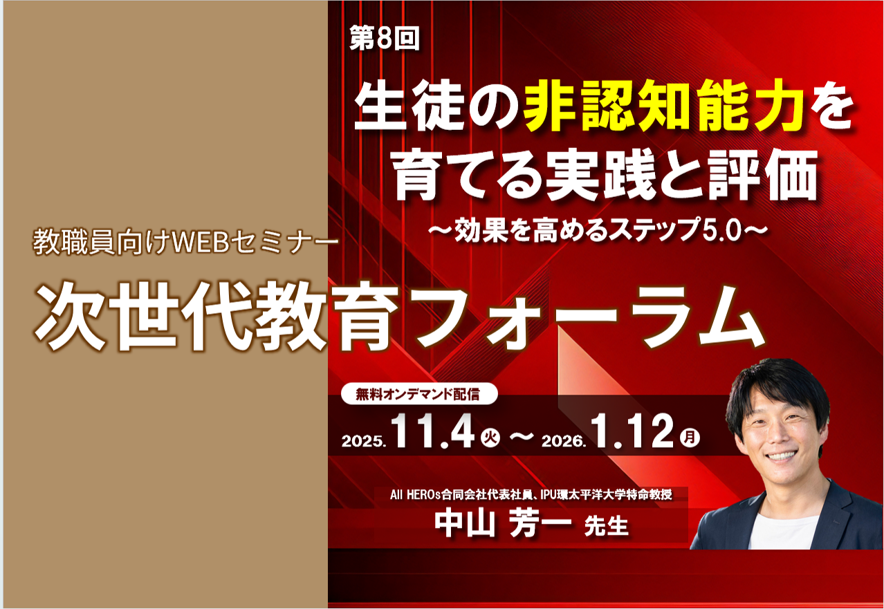 非認知能力の第一人者・中山芳一先生をメインゲストにお迎えし、授業を通じて生徒の非認知能力を育てるヒントや、AIを活用した評価ツールの活用事例などの情報をお届けします。