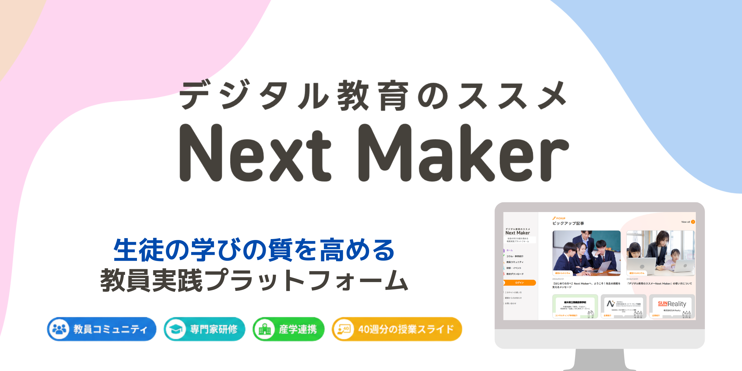 「情報Ⅱ」の授業づくりや、デジタルを活用した学びの展開に、戸惑いや不安を感じている先生方も多いのではないでしょうか。Next Makerは、「情報Ⅱ」を担当する先生方を中心に、デジタル教育を実践するためのオンラインプラットフォームです。(株)SUN Realityが開発し、当機構も開発・運営に協力しています。