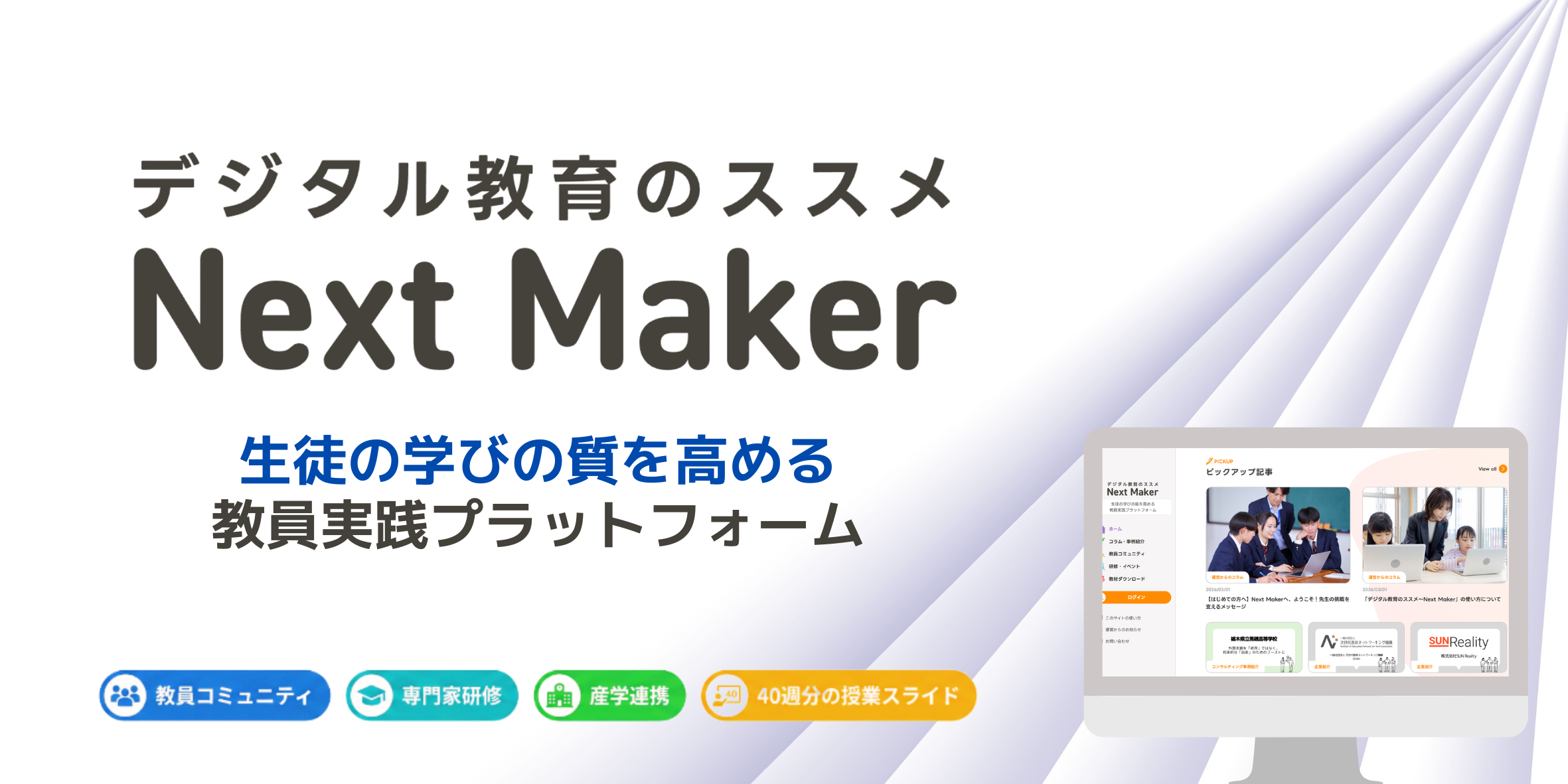 新教科「情報Ⅱ」を前に、教材や指導方法に不安を感じている先生方も多いのではないでしょうか。Next Makerは、そうした現場の声に応えるために生まれた、デジタル教育を実践するためのオンラインプラットフォームです。(株)SUN Realityが開発し、当機構も開発・運営に協力しています。