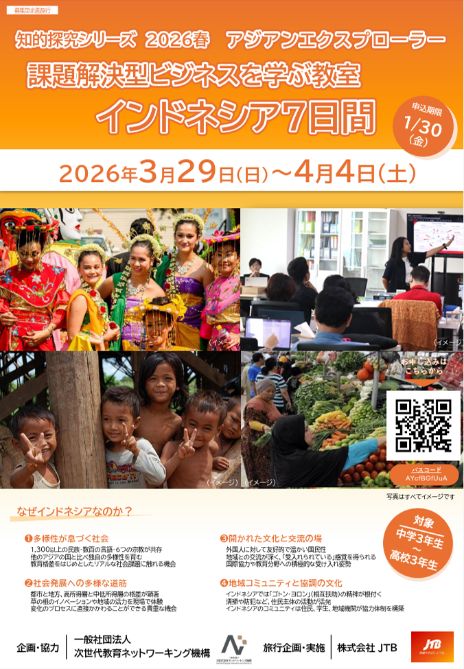 「社会に学び、未来を創る7日間」。多様性と課題が共存するインドネシアを舞台に、現地大学生と都市農業(アーバンファーミング)をテーマに協働します。デザイン思考とアントレプレナーシップを実践し、リアルな社会課題を通じてグローバルな思考力・共感力・行動力を育む実践型プログラムです。